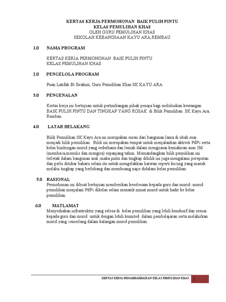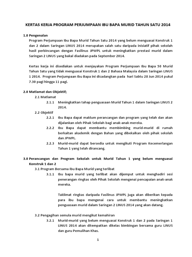 Contoh Kertas Kerja Program Perjumpaan Ibu Bapa Murid Tahun Satu Kelas Pemulihan Khas Pdf